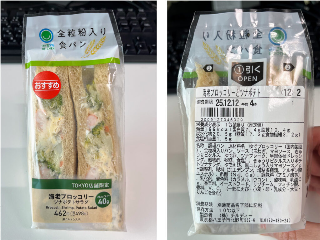 サンドウィッチはたくさん種類がありますが意外とカロリーが高いものが多いですが、このガバオ風サンドは218kcalと低カロリー。味も濃いめであらびき肉の触感もしっかりしています。パン自体も全粒個入でヘルシー。